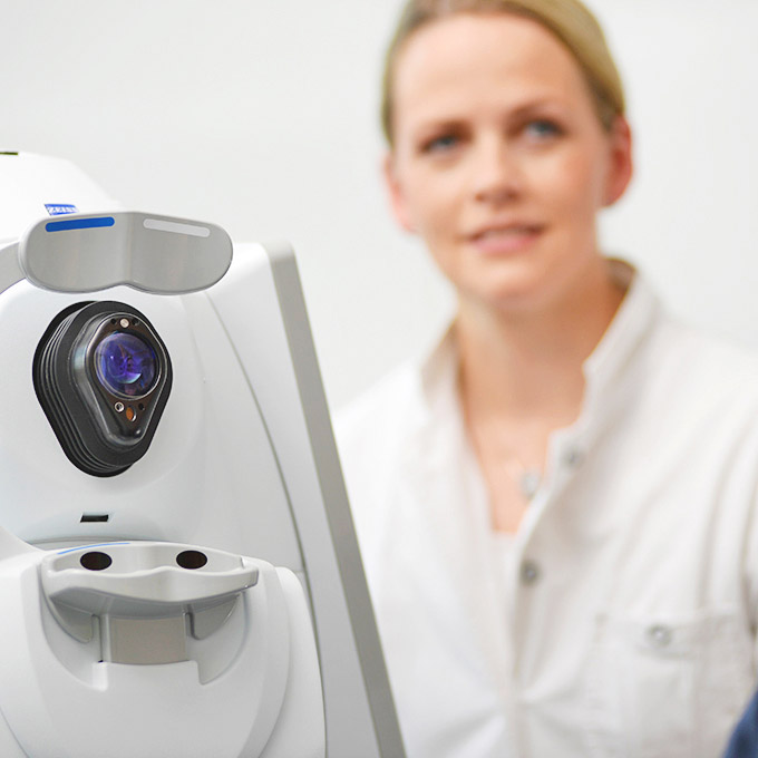 Die OCT ermöglicht eine sehr genaue bildliche Darstellung der Netzhaut, insbesondere der Makula, die für gutes Lesen und hohe Detailerkennung verantwortlich ist und der Nervenfaserschicht im Bereich des Sehnervenkopfes, welche sich beim Glaukom verändert.